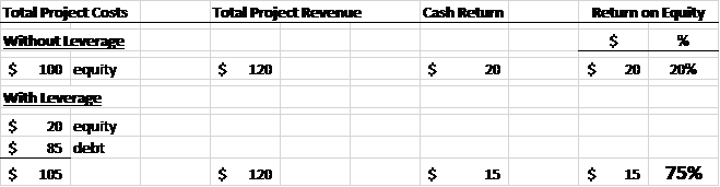 Using leverage in a real estate development means you’ll use less of your money, or equity, to achieve the same result.  You’ll have additional costs in the form of interest (and fees) so you’ll make less total cash, but the percentage return on the investment increases dramatically.  See picture below and explanation that follows.  I’ve used simple numbers to illustrate the concept.